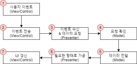 상황에 따라 Presenter에서 Model에 데이터를 요청하지 않을 수도 있지만 기본적인 형태는 위와 같다.