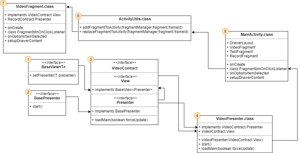 mvp형태는 그대로 가지고 있으면서 Contract, BasePresenter, BaseView 인터페이스가 추가되었다. 프래그먼트가 어떠한 방식으로 액티비티에 표시되는지 자세히 보도록 하자.