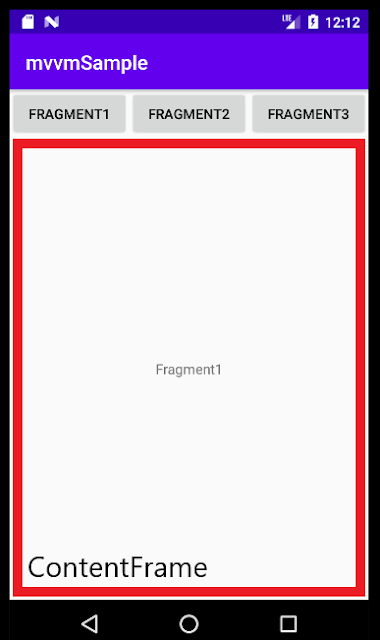 이미지6에 있는 빨간색 네모 부분이 activity_main.xml 의 FrameLayout이고 아이디가 contentFrame이다. 이곳에 3가지의 프래그먼트 뷰를 버튼을 활용해 교체해주는 것이다. 현재는 Frament1만 구현되어있는 상태이다. 프래그먼트가 액티비티에 표시되기 까지 ViewModel과 Databinding이 어떻게 활용되는지 살펴보자.