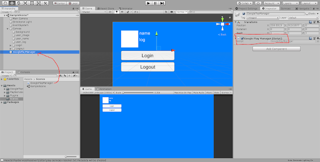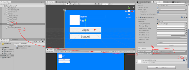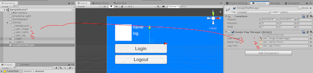 1번 클릭 -> 2번 플러스 클릭 -> 3번 GooglePlayManager 드래그해서 넣기 -> 4번 OnClickLogin() 메소드 셋팅