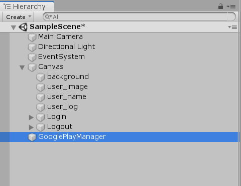 Hierarchy 창에서 오른쪽 마우스 클릭 -> Create Empty -> GooglePlayManager 오브젝트 명 변경