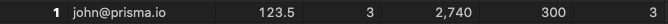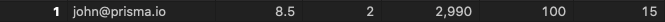 VALUES ('john@prisma.io', 1.5, 31, 3000, 20, 30);