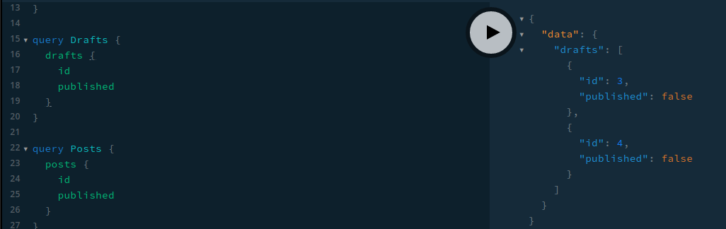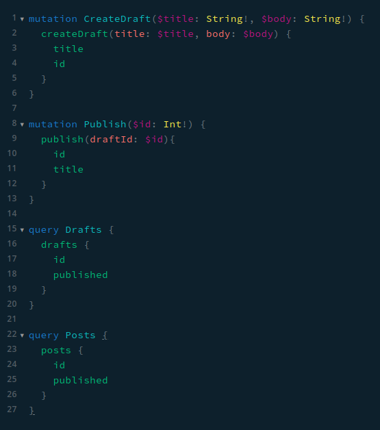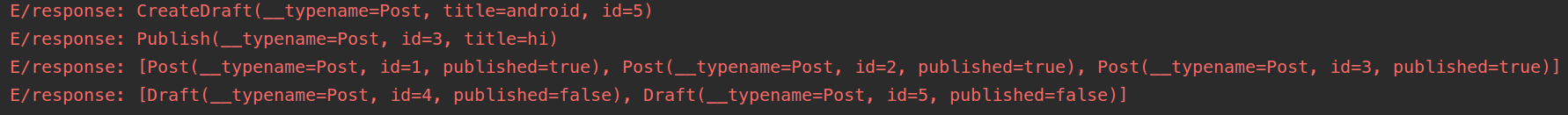 위에서부터 CreateDraftMutation, PublishMutation, PostsQuery, DraftQuery 를 차례대로 실행한다.