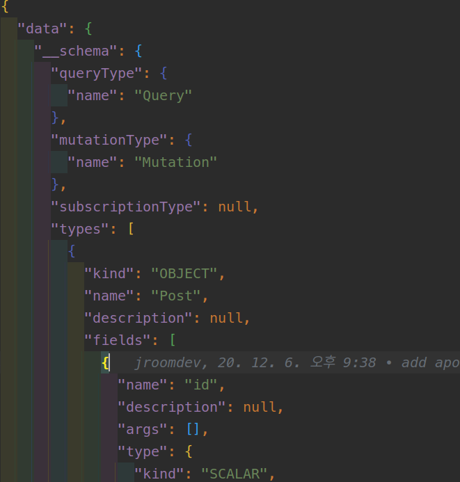 해당 명령어를 실행하면 schema.json 파일에 다음과같이 서버의 schema 정보가 자동으로 입력된다.