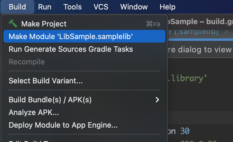Project에서 mylibrary선택 -> build -> Make Module 'LibSample.samplelib'