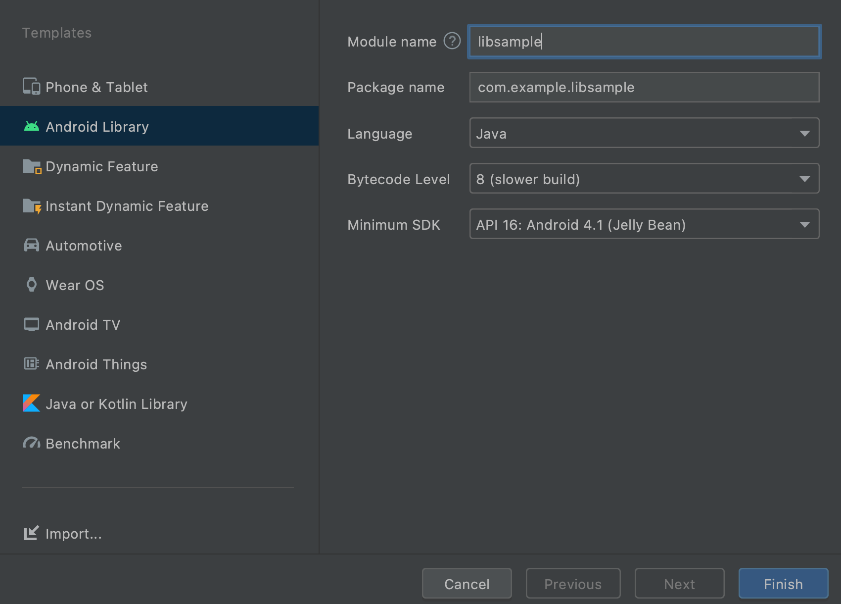 - File -> New -> New Module -> Android Library -> Finish