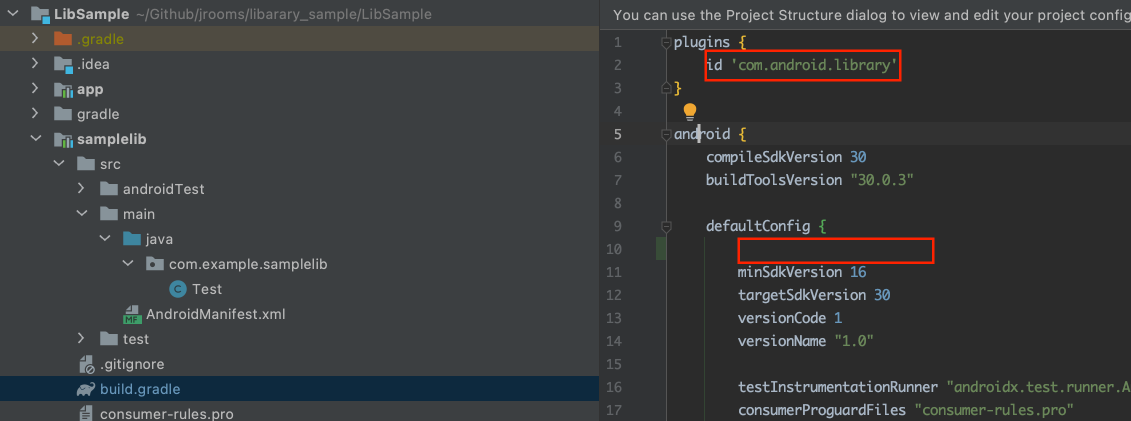 - defaultConfig에서 applicationId "com.example.libsample" 삭제